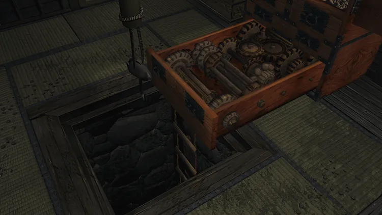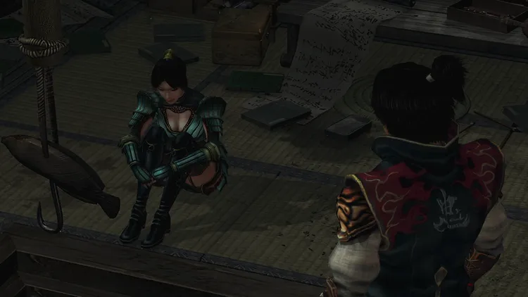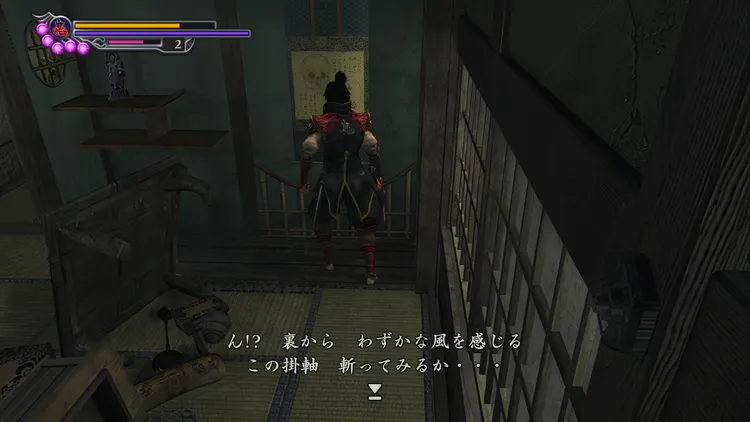 廊下を進み奥にある仕掛け宝箱から「力石」、奥の部屋に行くと美人画「賢木」、奥の部屋にある掛け軸を斬ることでキーアイテム「四神図(右)」、土間まで向かい、近くにアイテム「フォーク」がある。