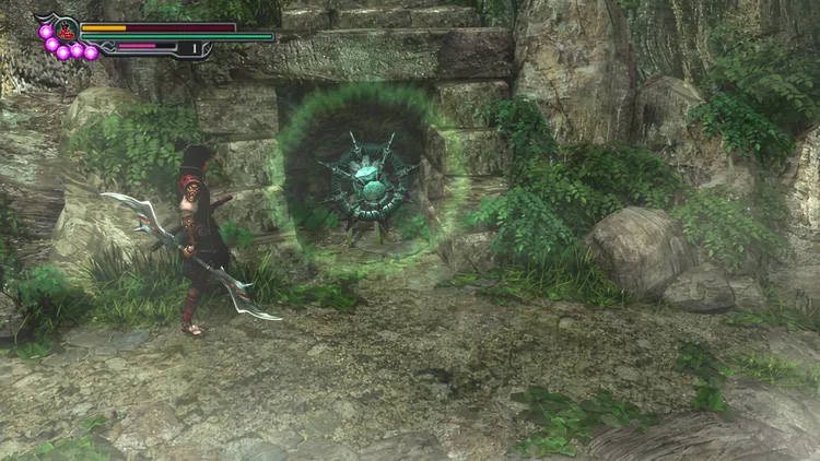 先に進み縄のようなものを斬ると、上から回転しながら進んでくる刃のトラップが作動する。