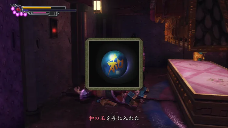 ジュジュドーマからキーアイテム「和の玉」を入手。その他には特にアイテムなどはないので、信長が書かれた絵の後ろにあったスイッチを押して隠し扉を開けて先に進もう。
