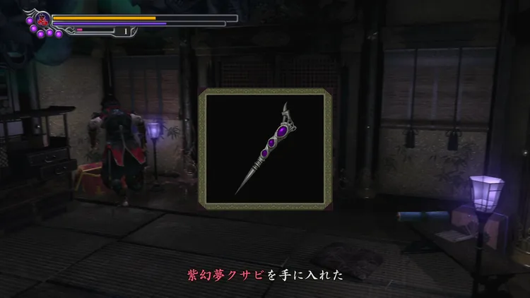 部屋の中にキーアイテム「紫幻夢クサビ」、書物「美人画蓮生」。