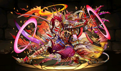 | 【スキル】 回復、お邪魔、毒ドロップを火ドロップに変化。 火ドロップを強化。自分以外の味方スキルが1ターン溜まる。 (12→8) 【リーダースキル】 |