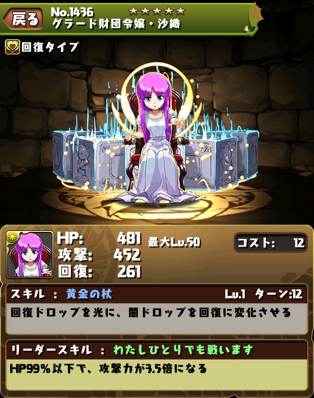 光属性で体力タイプは非常に貴重なので、光属性の体力パーティーを使っている方はサブに入れてみても面白いでしょう。