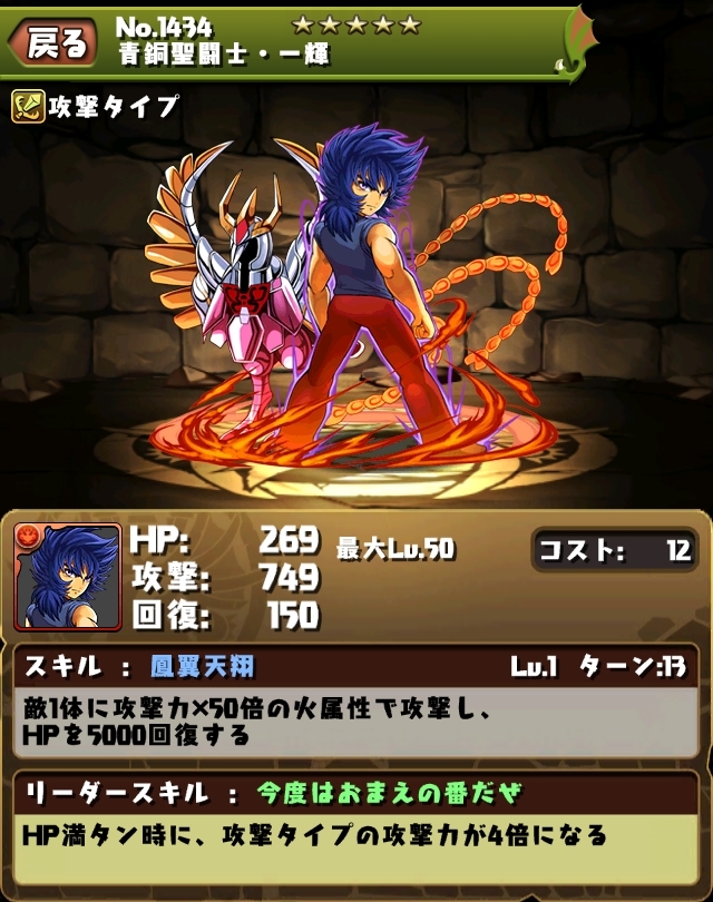 鳳凰星座の一輝は、キルアの劣化ではありますがリーダースキルが非常に強いモンスターです。HP満タンでしかリーダースキルが発動しないので、ノーマルダンジョン周回専用機として使えそうですね。