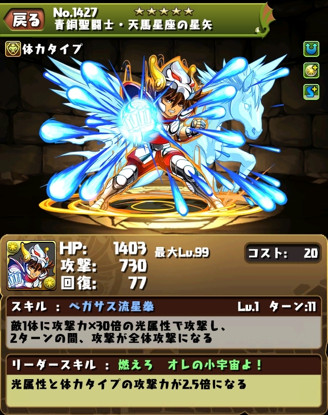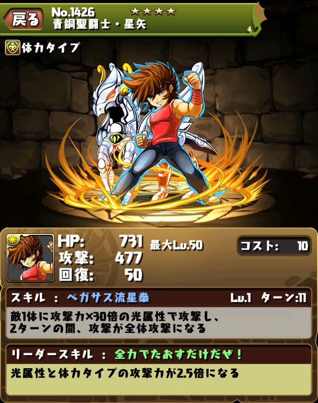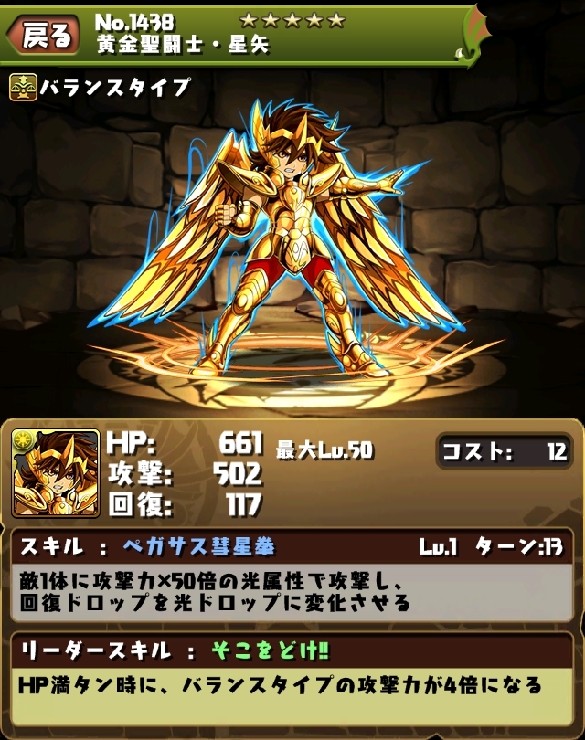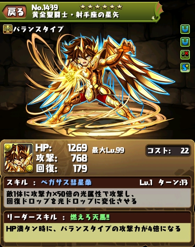 「黄金聖闘士・射手座の星矢」と「青銅聖闘士・鳳凰星座の一輝」もHP満タン時に攻撃力を4倍にしてくれる非常に強いモンスターとなっております。聖闘士星矢コラボガチャの中でも当たりの部類に入るでしょう。