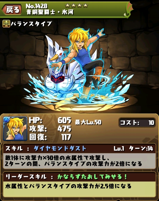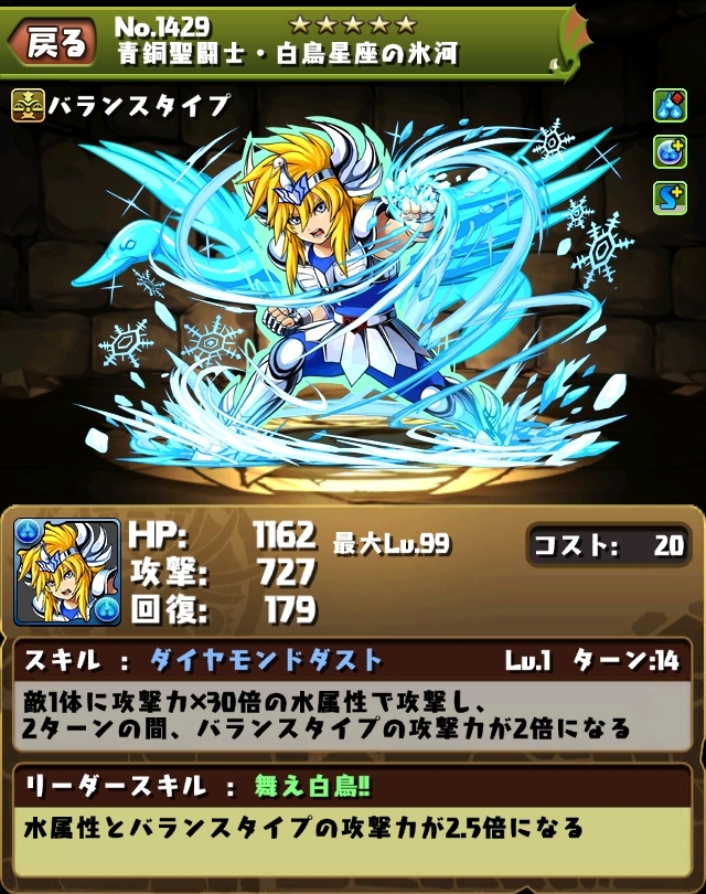 白馬星座の氷河は2ターンの間バランスタイプの攻撃力を2倍にするという強力なスキルを持っています。今まではバランスタイプの究極イズイズを使用していたかたも多いとおもいます。ですが氷河のおかけでターン数は重くなりますが火力が出やすくなったと思います。