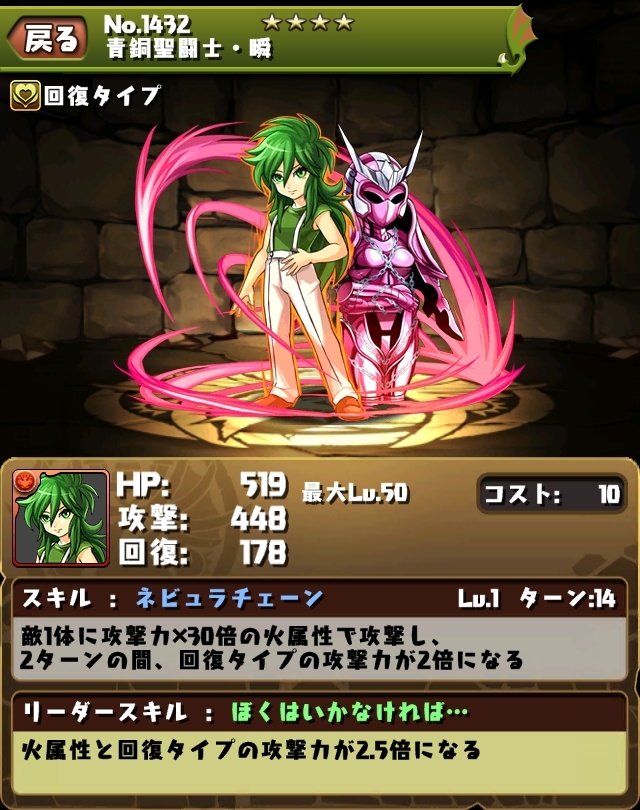 アンドロメダ星座の瞬は、回復タイプの攻撃力を2倍にしてくれるスキルを持っていますが、火属性の回復タイプパーティーは作ることはないですし、現状では活躍する場はほぼないと思います。