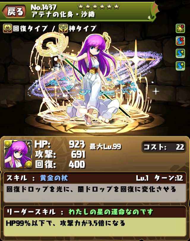 アテナの化身・沙織はスキルがとても面白く、感覚的には天使シリーズの三属性たちと似てますね。光属性で神・回復ととても恵まれてる環境に対応したモンスターになっています。