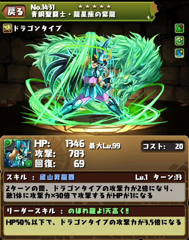 今まではドラゴンタイプのエンハンス枠は、ショウグン、ドラりんを使うことが多かったと思います。(木染めでもステなどの理由でショウグンを入れることもありました)ですが、木属性のドラゴンエンハンスが出て来たので、木属性のドラゴンパーティーを使っている方には非常に活躍してくれるでしょう。