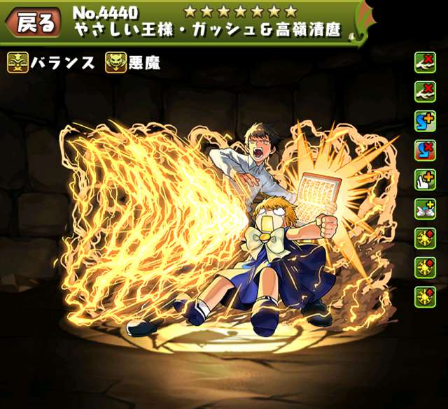 ★★★☆☆ | ガッシュのスキルを使うだけで最大火力と6倍の回復力を得られます。7×6マスなので少ないコンボで突破する運用はほぼありませんが、光属性強化を増やして火力面の貢献もできます。 |