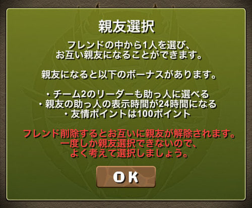 ログインしてから24時間親友を助っ人として使えるとのことですので、毎日1回ログインしていればずっと助っ人として表示されるようになります。また、親友になると何度でもそのリーダーを使えるというのは非常に便利ですね!