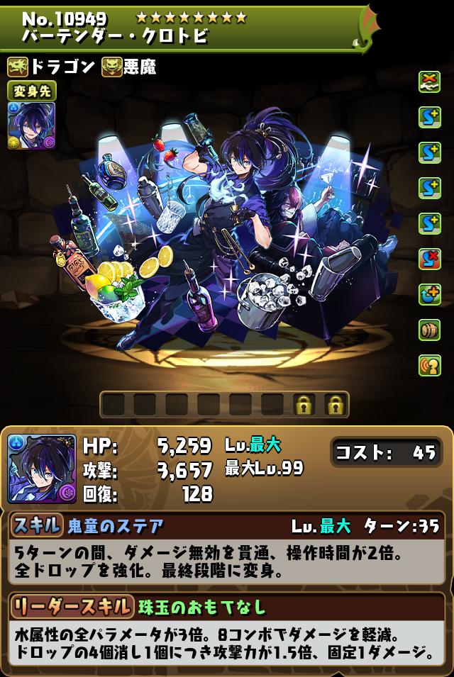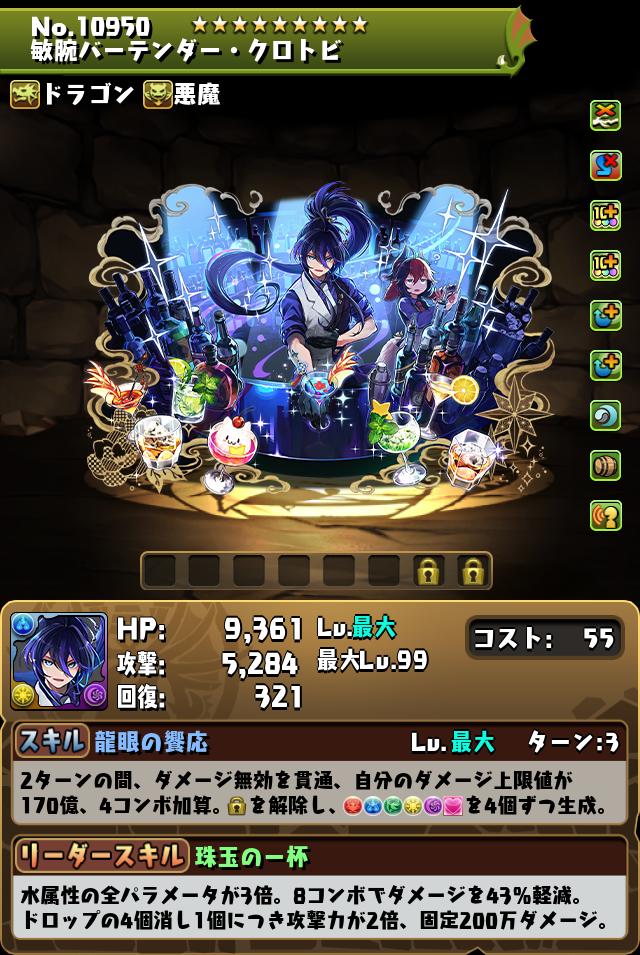 パズドラのバーテンダークロトビの評価と潜在覚醒おすすめを紹介しています。パズドラのバーテンダークロトビのスキルや覚醒はもちろん、ステータスや入手方法なども記載していますので、バーテンダークロトビ(歴世の杯と神創の雫イベント)は強いかの参考にご覧ください。