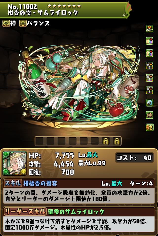 | 木か光を9個つなげて消すとダメージを半減、攻撃力が60倍、固定2000万ダメージ。木属性のHPが2.7倍。 | |||