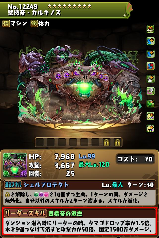| ダンジョン潜入時にリーダーの時、タマゴドロップ率が1.5倍。木を9個つなげて消すと攻撃力が50倍、固定1500万ダメージ。 | |||