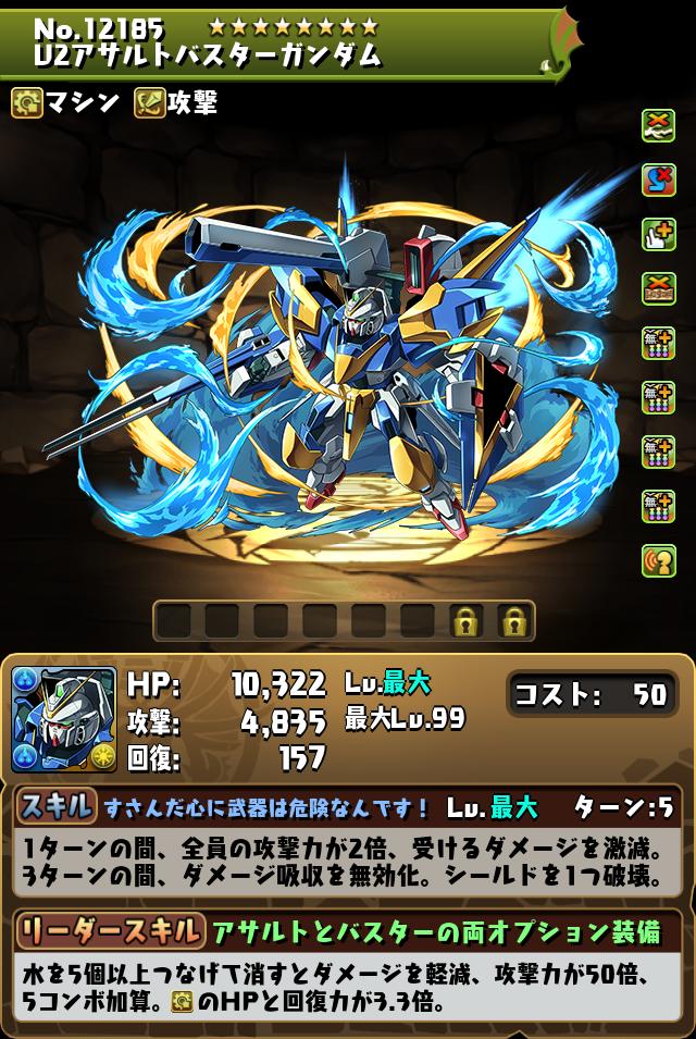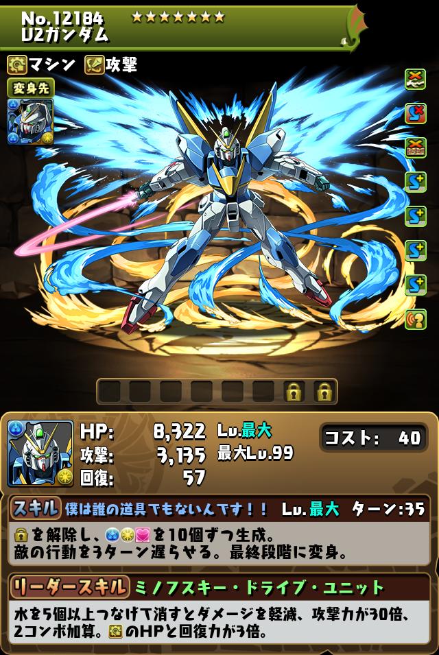 | 水を5個以上つなげて消すとダメージを軽減(35%)、攻撃力が50倍、5コンボ加算。マシンタイプのHPと回復力が3.3倍。 | |||