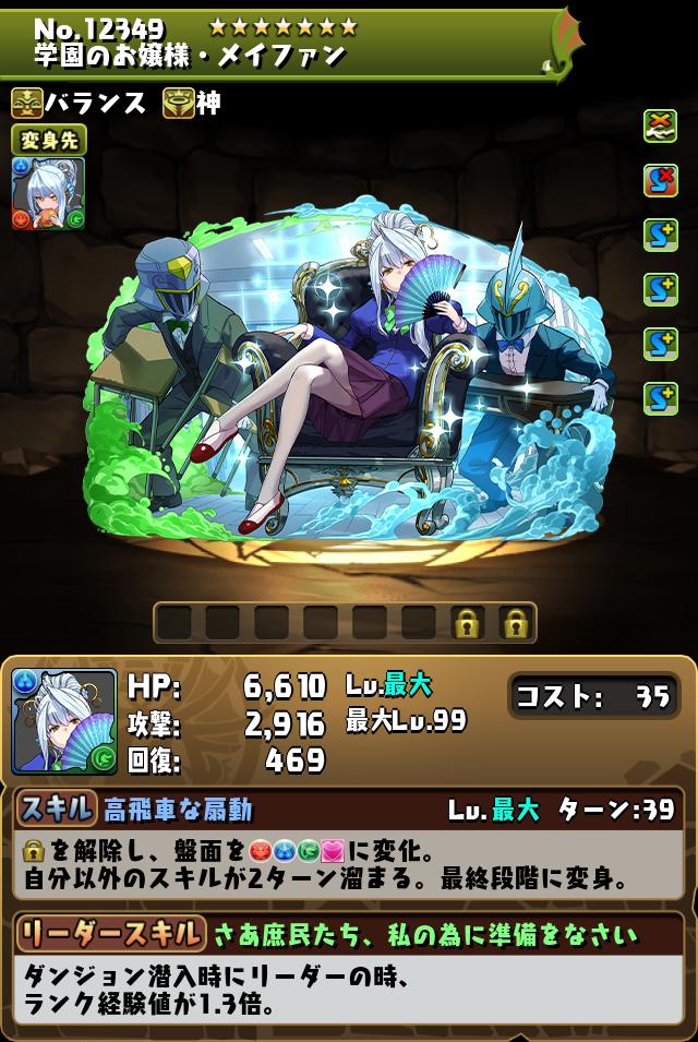 パズドラの学園メイファンの評価と潜在覚醒おすすめを紹介しています。パズドラの学園メイファンのスキルや覚醒はもちろん、ステータスや入手方法なども記載していますので、学園メイファン(新学期イベント)は強いかの参考にご覧ください。