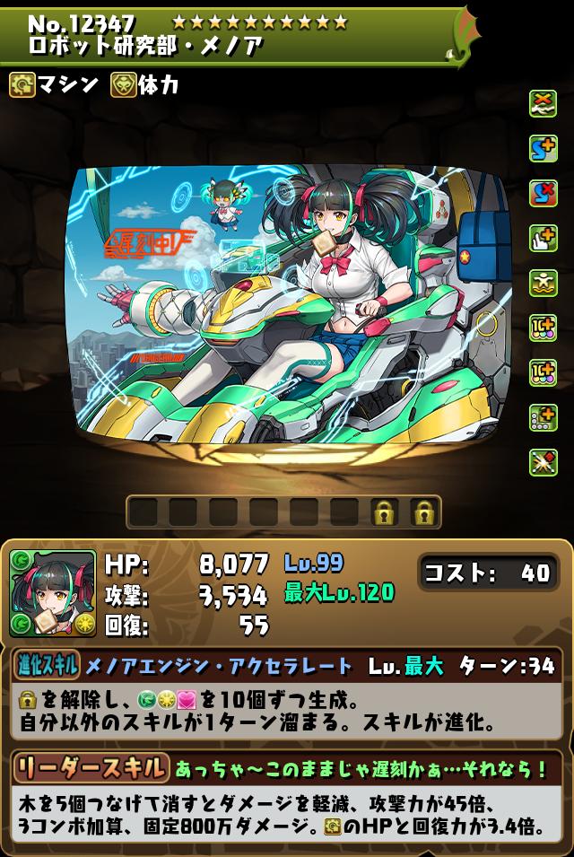 | 木を5個つなげて消すとダメージを軽減(35%)、攻撃力が50倍、3コンボ加算、固定800万ダメージ。マシンタイプのHPと回復力が3.4倍。 | |||