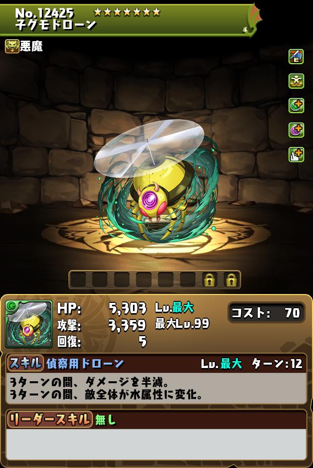 3ターンのダメージ半減に敵を水属性に変える効果が付いている。木属性パーティで使うのであれば火属性の敵には特に効果が高い。