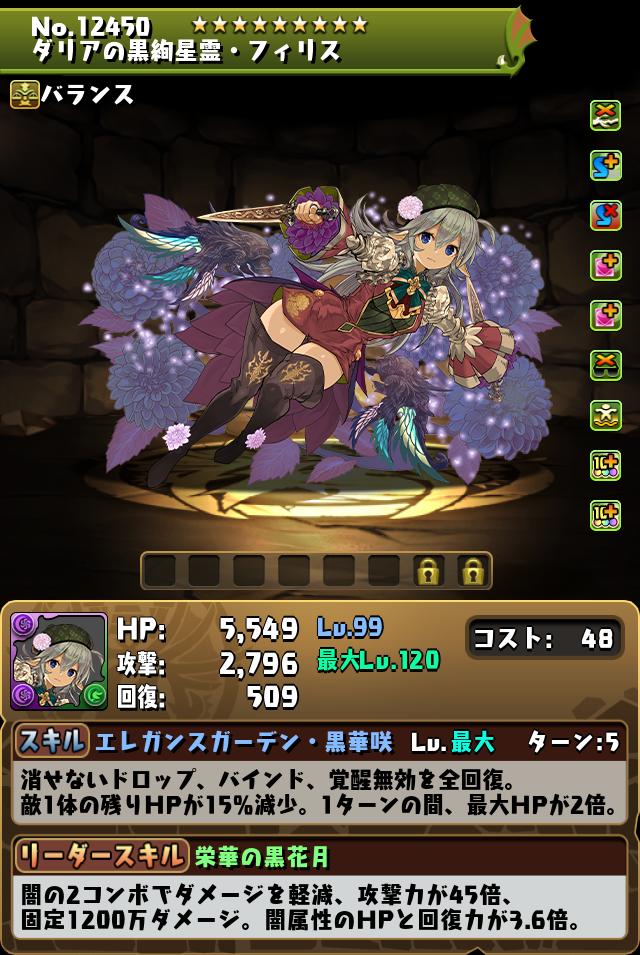 | 闇の2コンボでダメージを軽減(30%)、攻撃力が45倍、固定1200万ダメージ。闇属性のHPと回復力が3.6倍。 | |||