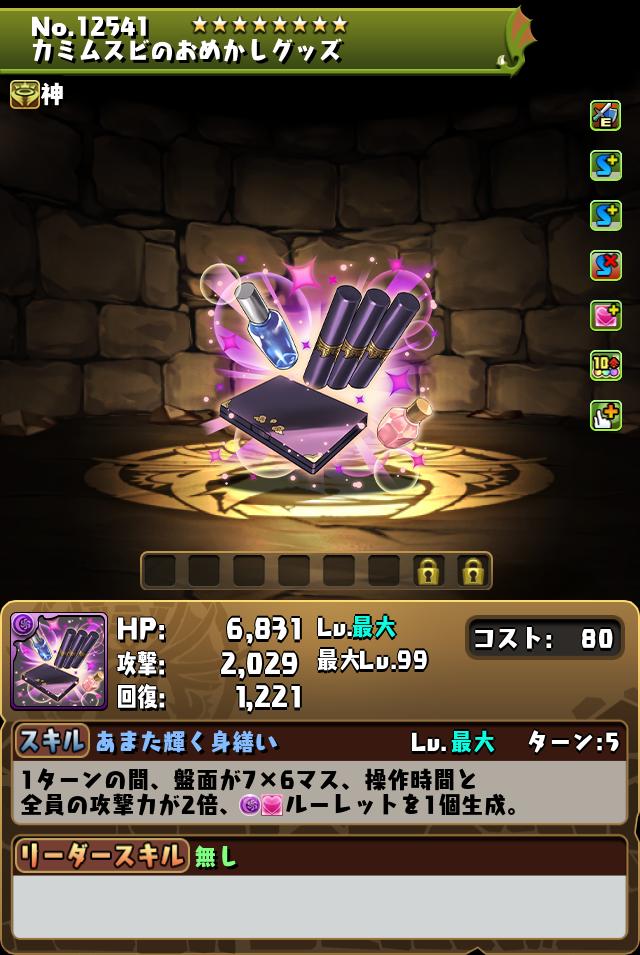 超コンボ強化を付与する装備の中ではさほど強力とは言い難いが、スキブ・封印耐性不足のパーティで役立ち、回復ドロップ強化も地味に有用だ。