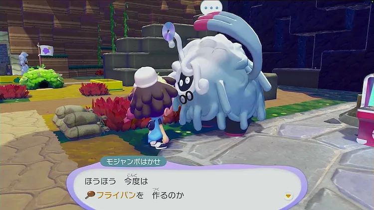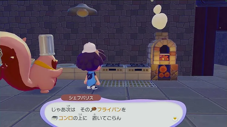 作ったフライパンを持ってヨクバリスに話しかけると、フライパンをコンロの上に置くことでハンバーグが作れるようになると伝えられる。