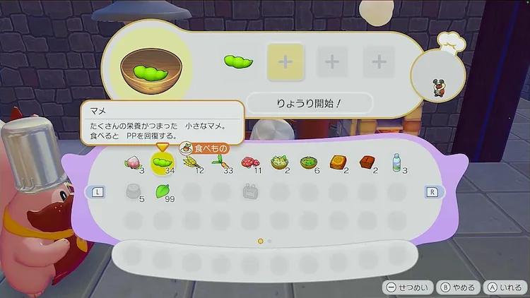 フキダシが出ているヨクバリスに話しかけると、サラダやパンを作った腕前を買われハンバーグを教えてもらえる。