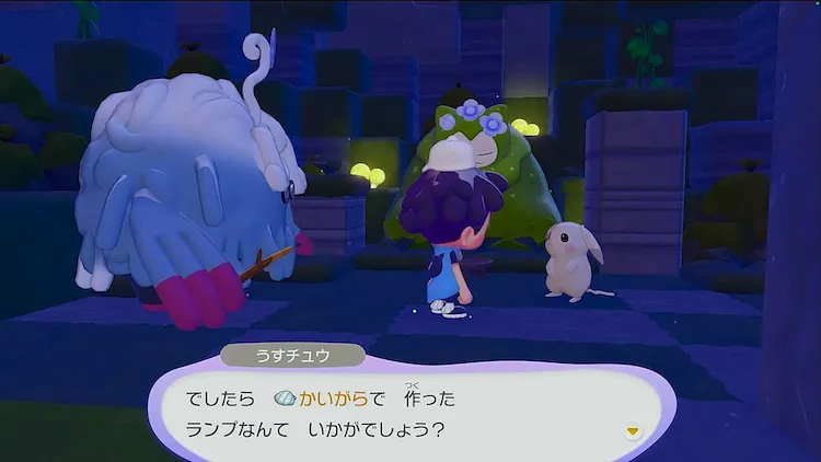 「かいがらランプ」を作って壁に置いたら、電気を点けるためにはつでんができるポケモンを連れてこよう。