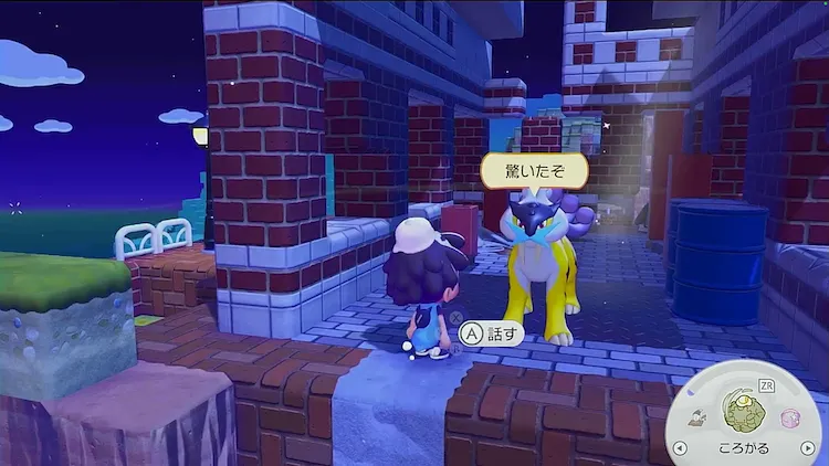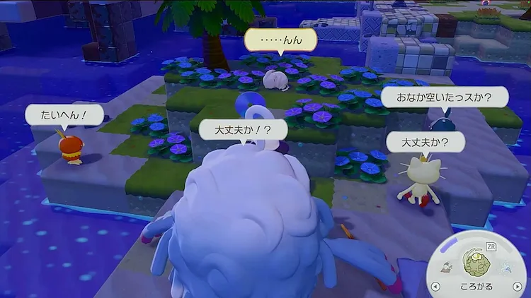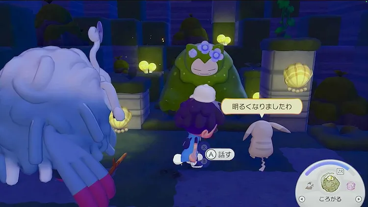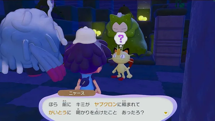 複数箇所の街灯をつけたらニャースに話しかけて、コケむしカビゴンの様子を伺う。