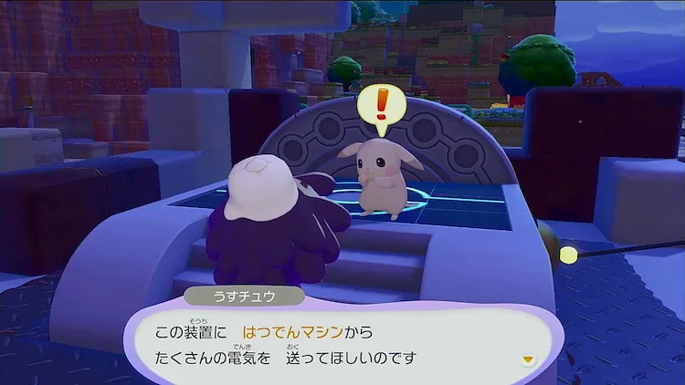 洞窟からピカチュウについていくと、大きな装置がありこの装置にたくさんの電気を流して欲しいというおねがいごとをされる。