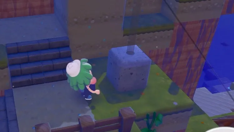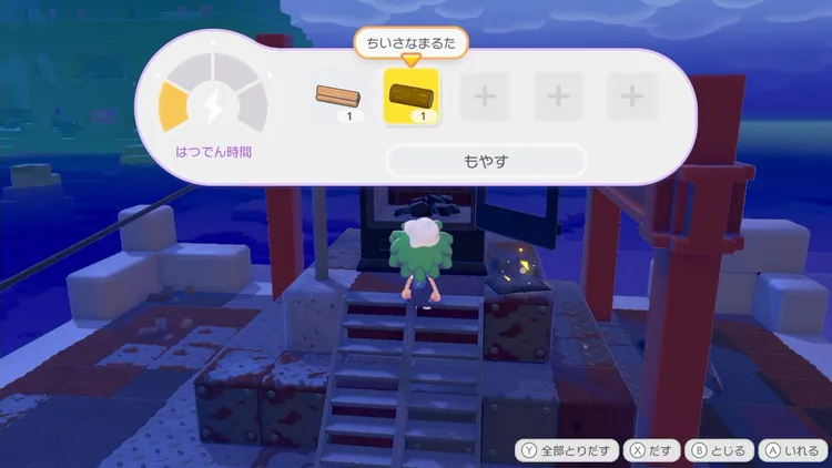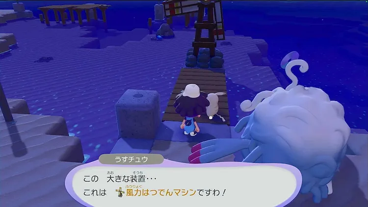 ピカチュウについて行った先に風力はつでんきが置いてあるので、近くにある電柱を回収して発電機と繋がるようにブロックに置こう。