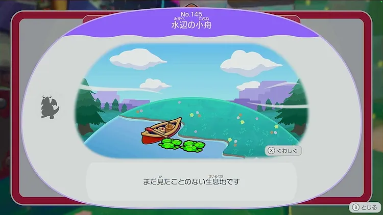島の一段上がった場所にカヌーが浮いている水場があるので、そこを起点に生息地「水辺の小舟」を作ろう。
