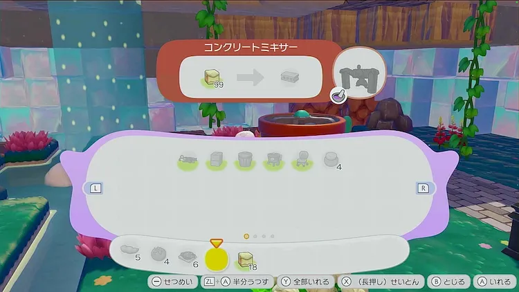 コンクリートの材料は、せっかいせきなので必要な個数を集めてコンクリートミキサーに入れよう。