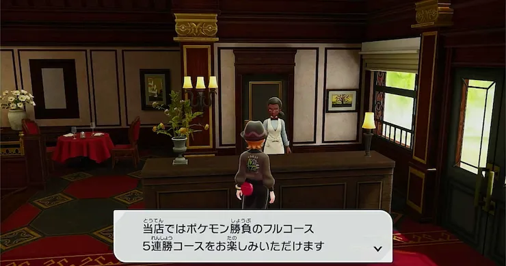 - レストランの受付に話しかけポケモンバトル5連戦に勝利する