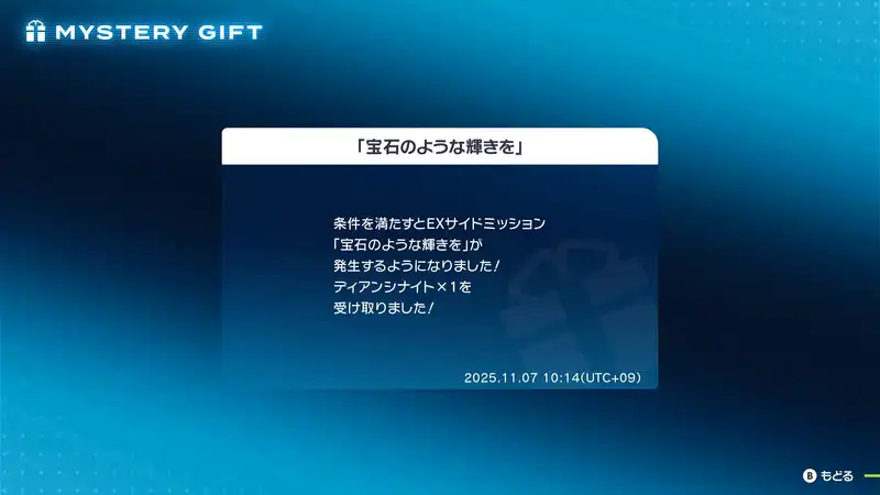 EXサイドミッション「宝石のような輝きを」を攻略するためには、まず「ふしぎなおくりもの」からディアンシナイトを受け取っておく必要がある。