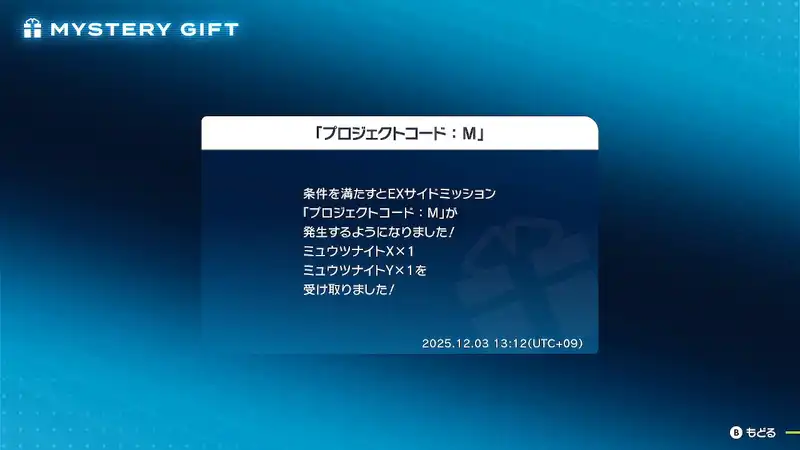 EXサイドミッション「プロジェクトコード:M」を攻略するためには、まず「ふしぎなおくりもの」からミュウツナイトを受け取っておく必要がある。