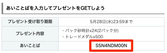 期間中、専用サイトにてあいことばを入力するとアイテムを獲得できる。パックを引ける砂時計を入手できるため、期間中は忘れずに入力しておこう。