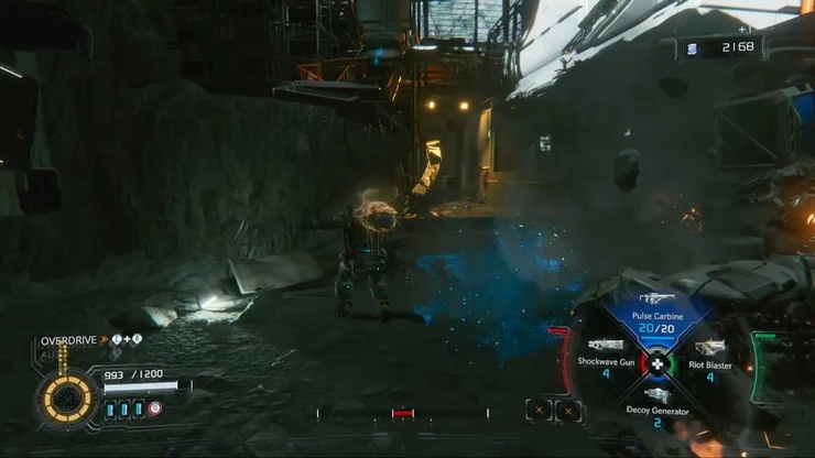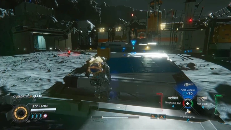 エスケープハッチから屋外へ出よう。対岸の足場に砲台型の敵がいるので、先に処理しておこう。