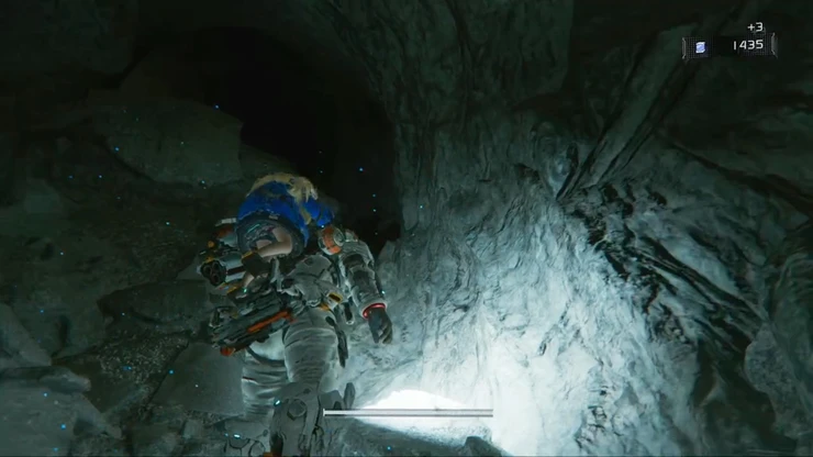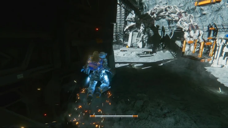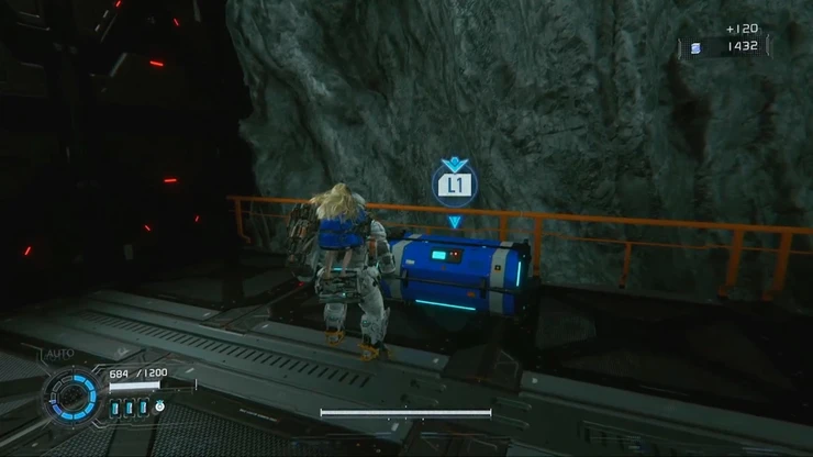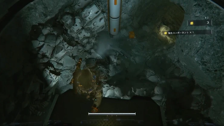 エスケープハッチから下層へ降りて、ルナディガーの通り道を進んでいく。降りる際、対岸の足場にアイテムがあるので、回収しつつ降りていこう。