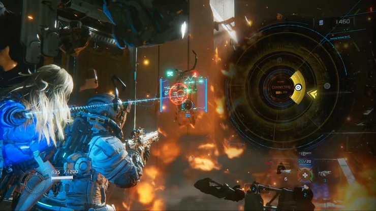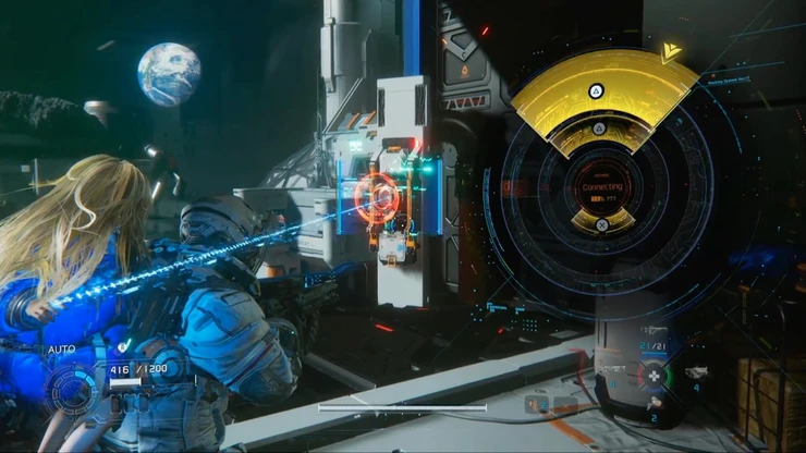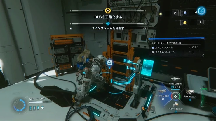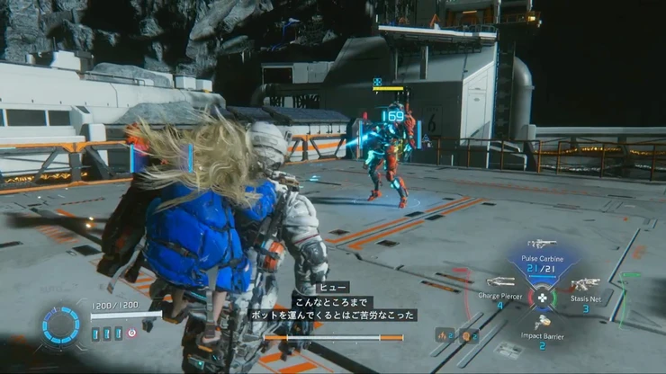 次のエリアでは、地上の端末にハッキングすることで足場となるコンテナを下ろすことができる。複数の敵が出現するので、予め倒してからハッキングを行おう。