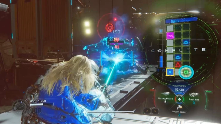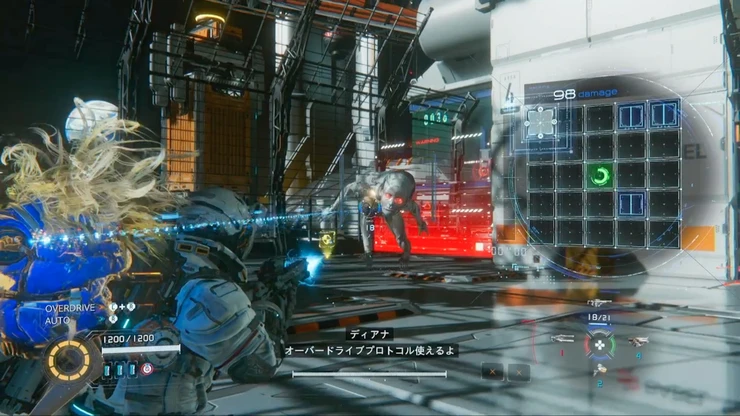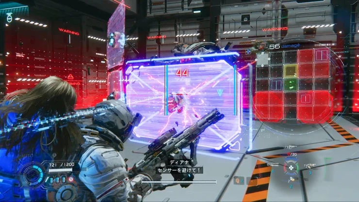まずは付近に出現する遠距離型の敵を倒しておこう。ハッキングでのミサイル打ち返しが有効。
