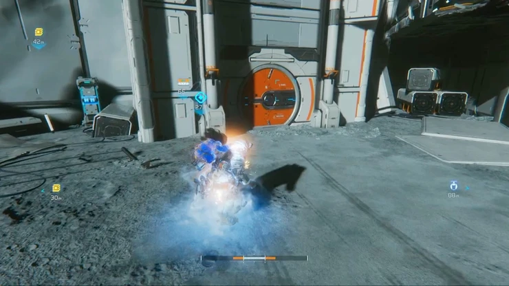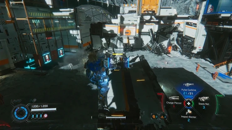 右側に見える大型ボットが配置されている戦闘エリアへ向かい、全ての敵を倒そう。敵撃破後、奥にある端末をハッキングすれば、足場となるコンテナが下りて奥の扉へ進むことが可能だ。
