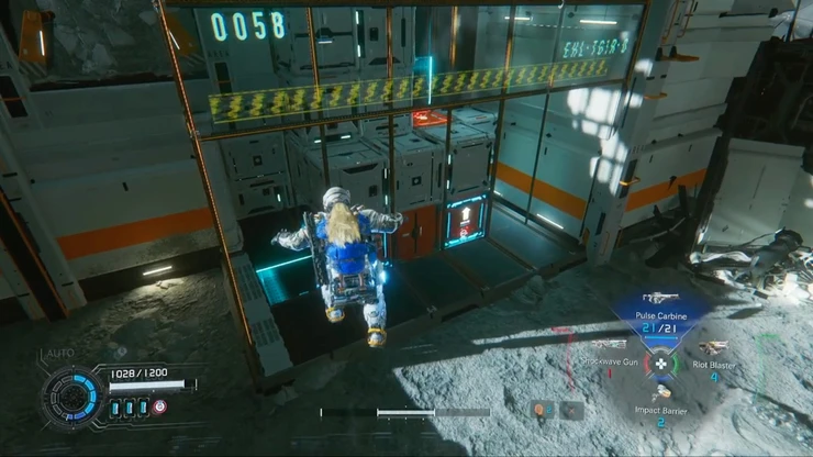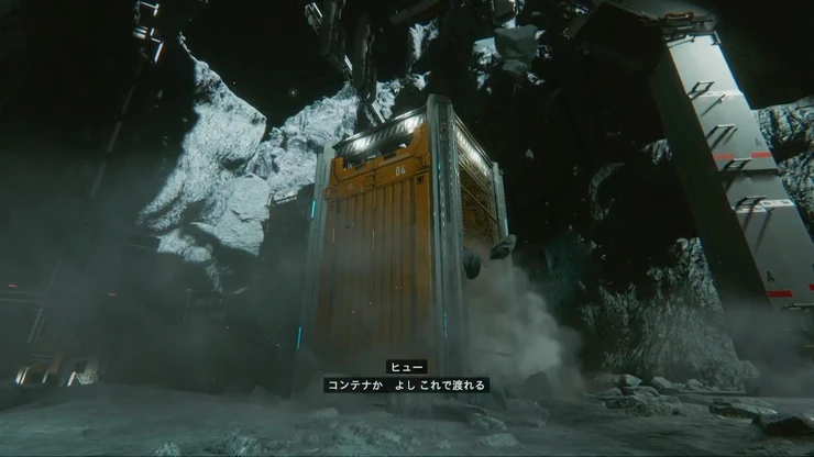 リフトで下層へ降りたら、コンテナの上からスラスターで飛んで対岸へ向かおう。