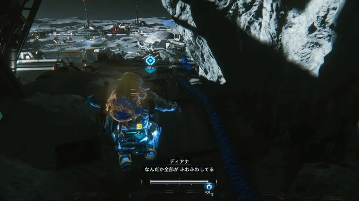 採掘機操作室の扉を出ると月面に出る。月面を進み丸い扉から再び施設(廃墟)内に入ろう。