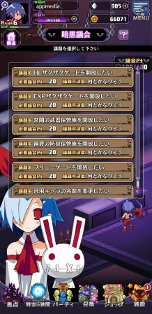 暗黒議会では、議会を開いてショップのお得意様RANKを上げたり、暗黒ゲートの経験値稼ぎなどに便利なステージを期間限定で解放することができます。ただし議題を出すには議会Ptが必要となります。1日に使用できる議会Ptには限りがあるため、議題を出す際には慎重に。また、可決されにくい議題を出す場合は、議員に”ワイロ”を送ることで、可決される確率を高めることができます。