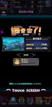 魔界調査団では、いらなくなったキャラを左遷(売却)することで、左遷したキャラで調査隊を編成することができます。編成した調査隊は魔界に派遣することができ、派遣した魔界と時間に応じて報酬を受け取ることができます。派遣を繰り返すことで、調査団RANKが上がり、派遣できる魔界が増えていきます。