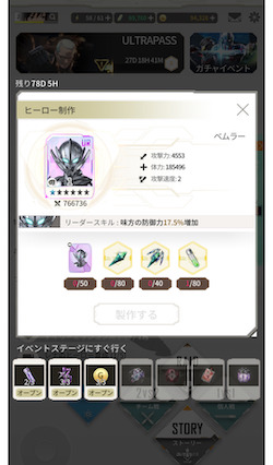 本作では上記のヒーローガチャ・装備ガチャとは別に、「製作」でヒーローや装備を入手することができる。この製作に必要なアイテムを入手できるのが期間限定の「イベント」だ。先行プレイでは宇宙怪獣ベムラーをテーマとしたイベントが楽しめたのだが、中には弾幕シューティングのようなステージも!通常とは全く異なるゲーム性に大変驚いたと同時に、遊べば必ず最高レアのヒーローや装備がゲットできる気前の良さに感服した。