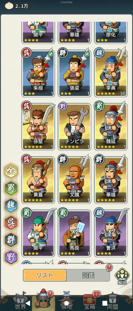 三国時代というだけあって、 ゲーム内では「孫堅」や「趙雲」など名のある三国志武将が多数登場。武将リストを見るとおなじみの魏・呉・蜀のほかに群・野の文字が。