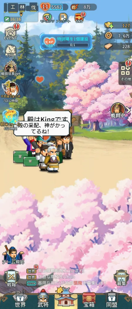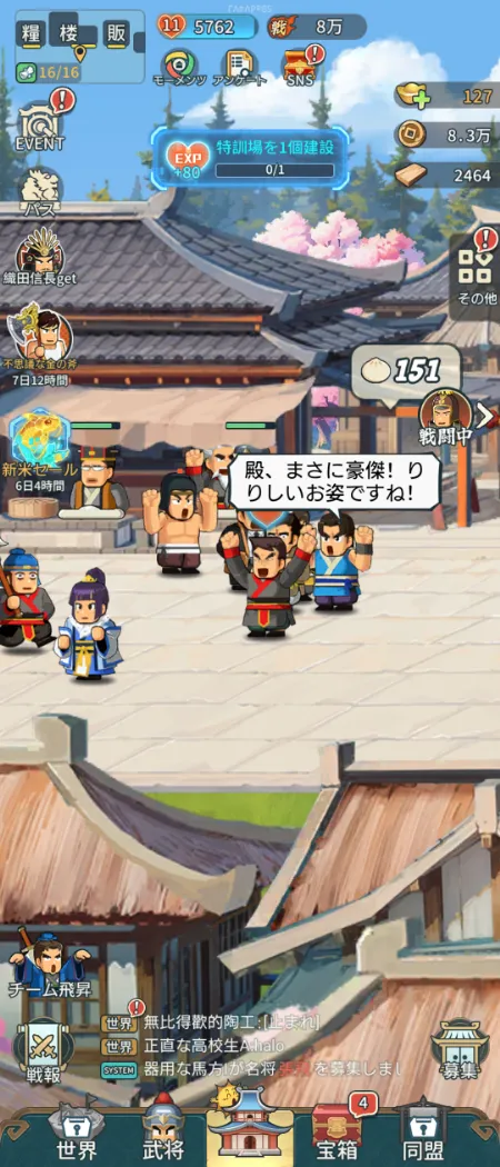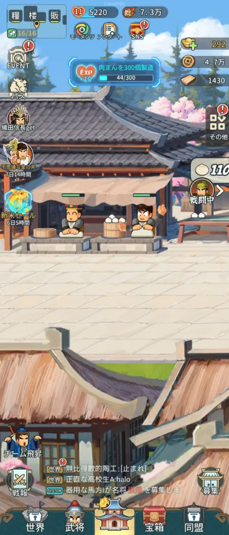 ゲームは平凡なサラリーマンが異世界転生し、三国時代へ来てしまい主君になるところからスタートします。木を切ったり麦を刈ったり「肉まん」を作ったりしながら、民を導いて国を大きくしていきましょう。採取や素材作り、戦闘はなんとオートで進行!放置しているだけで、どんどん強くなれるんです。