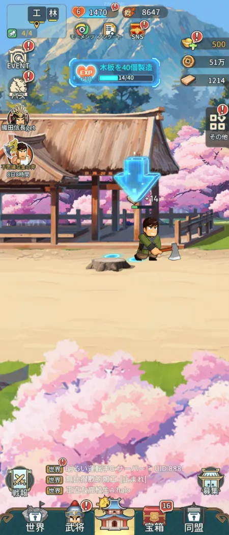 序盤は木板を効率よく集めることができるように、レベルを上げた武将を配置するのがオススメです。