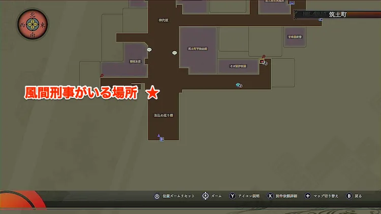 風間刑事はマップ南西の丑込め返り橋のたもとにいる。