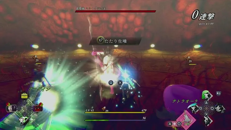 戦闘開始時から使用してくる"たたり生唾"は高誘導・高弾速で横移動では回避が難しい。敵に張り付いてかごめ舞で背後にまわって回避するか、前回避で避けよう。